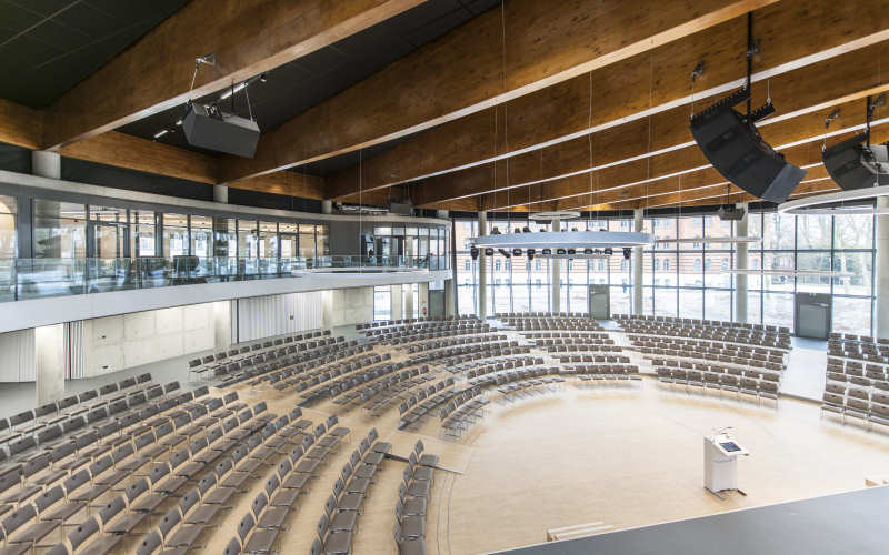 Bei der Konzipierung der Medientechnischen Ausstattung wurde auf jegliche Bildprojektion verzichtet. Zum Einsatz kommen Displays bzw. LED-Wände, auf die von zentraler Technik zugegriffen werden kann. Steuerungssysteme, Audio-Video- Konferenzanlagen, sowie Lichttechnik für die Veranstaltungen runden die Grundausstattung des Neubaus ab. Modernste hochauflösende Kameratechnik ermöglicht hochwertige Bildübertragung auch im großen Saal, ohne dabei vom Geschehen ab zu lenken.